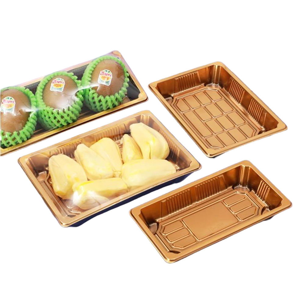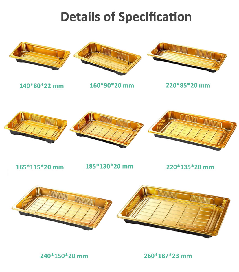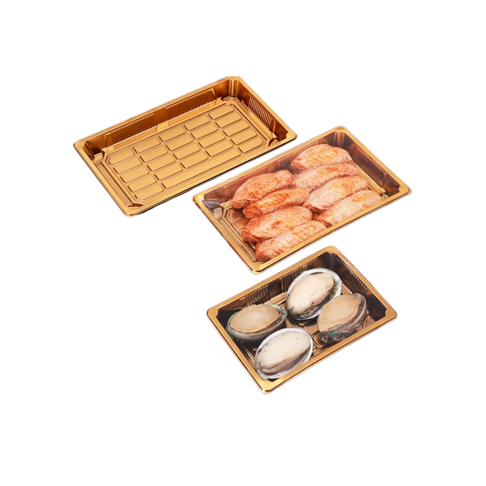 JF Series golden plastic food trays are our general food packaging for beef, meat, salmon, fruit, etc., there are various sizes and printings you can choose.