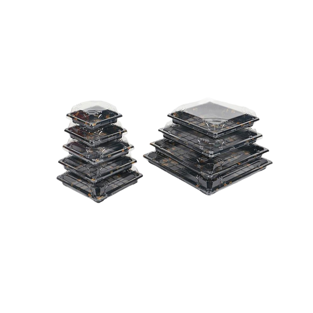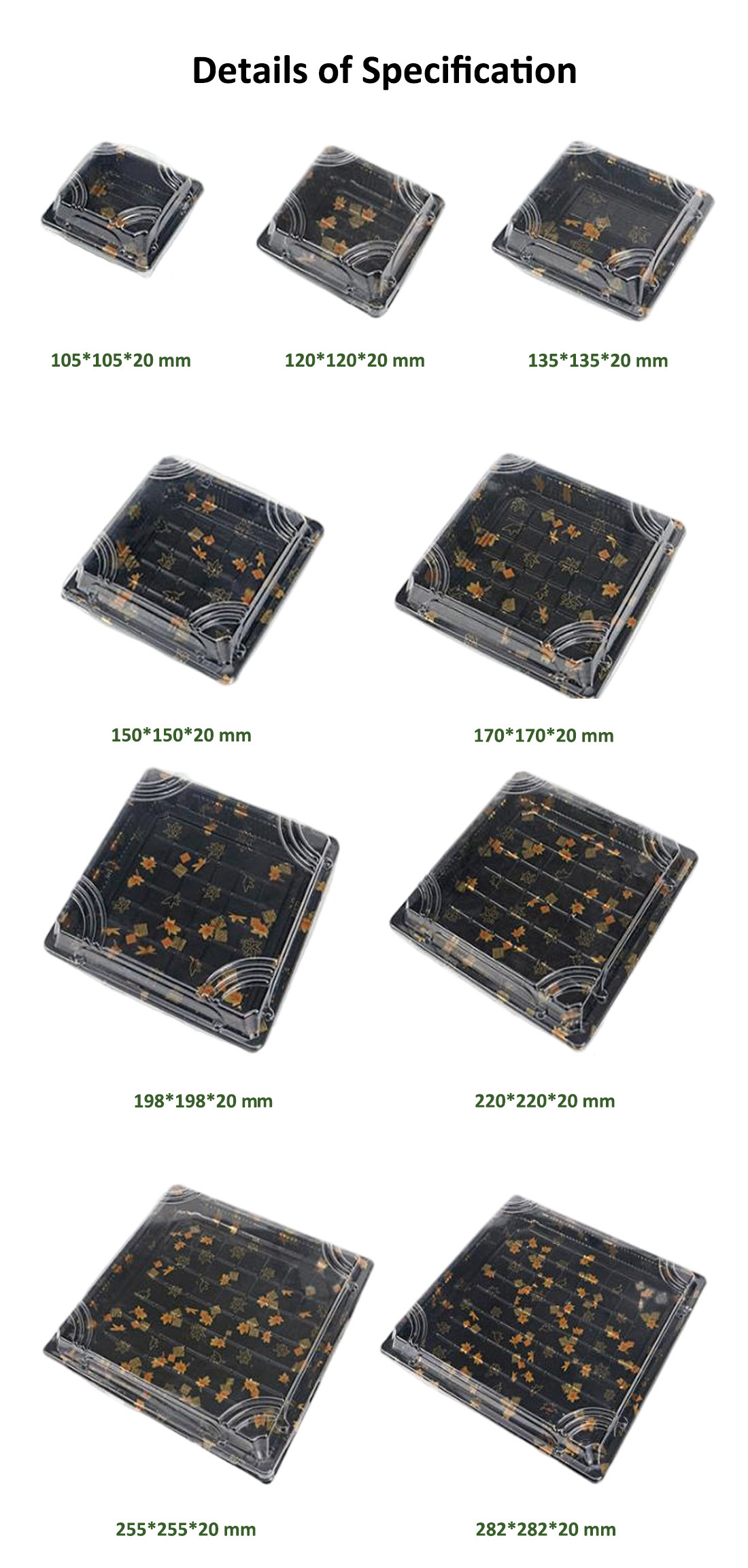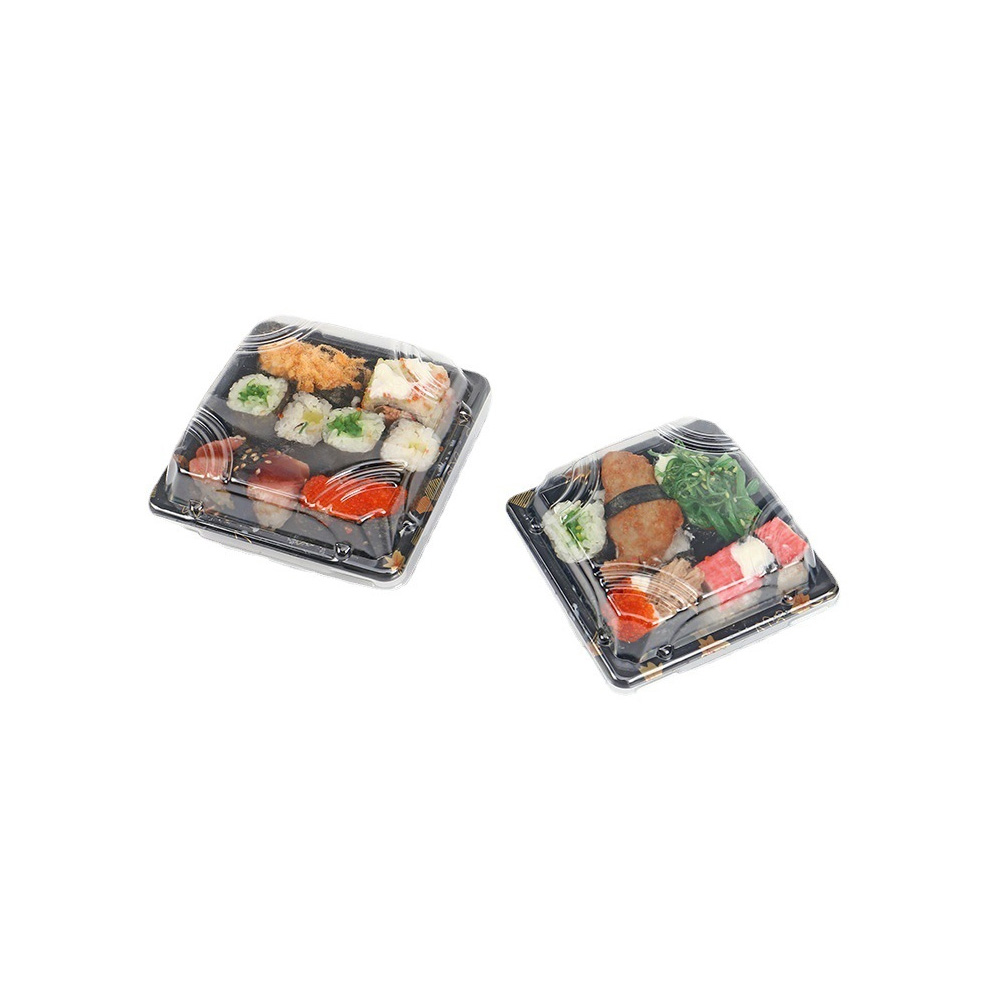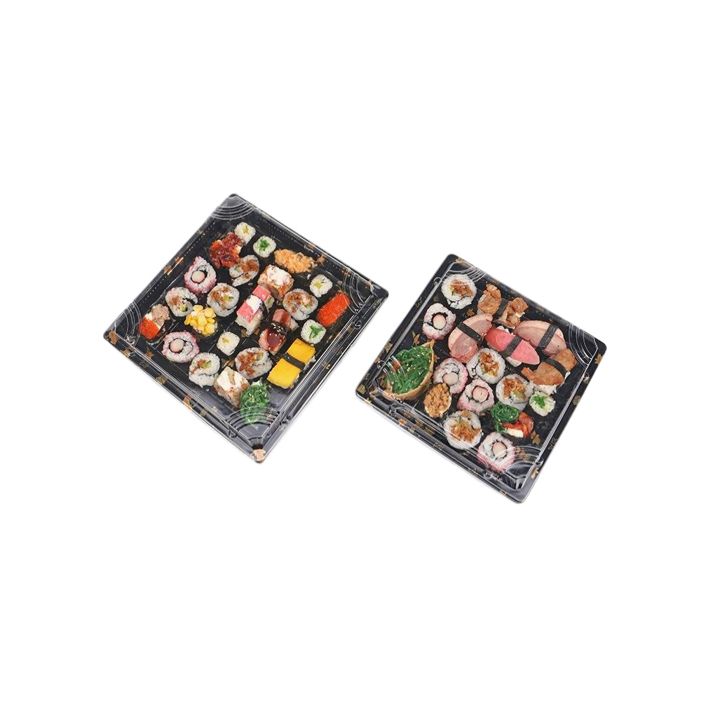 JF Series square golden leaf sushi containers are our general Japanese food packaging for sushi, there are various sizes and printings you can choose. We also provide sushi containers made of PP, PLA, PET, and biodegradable fiber pulp.