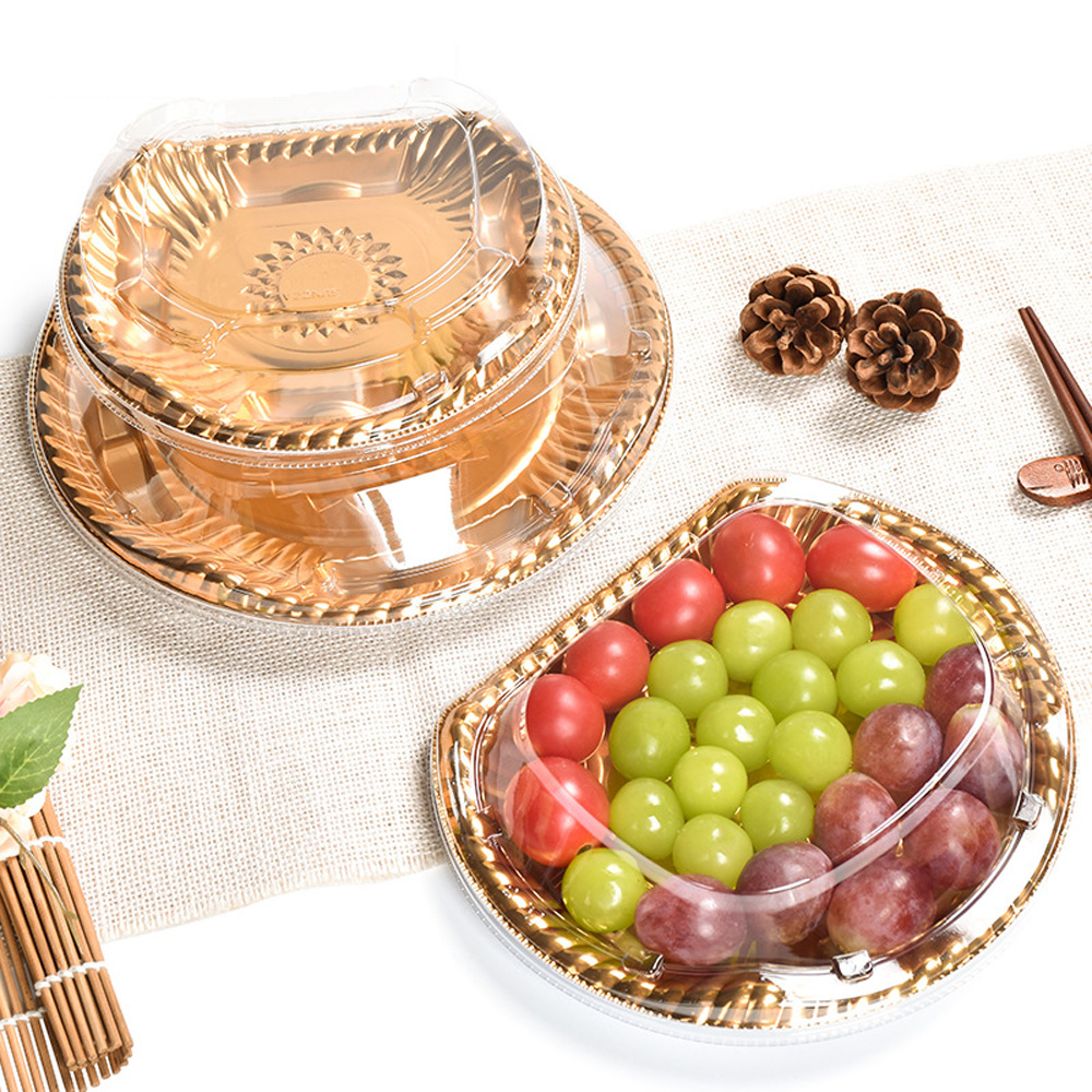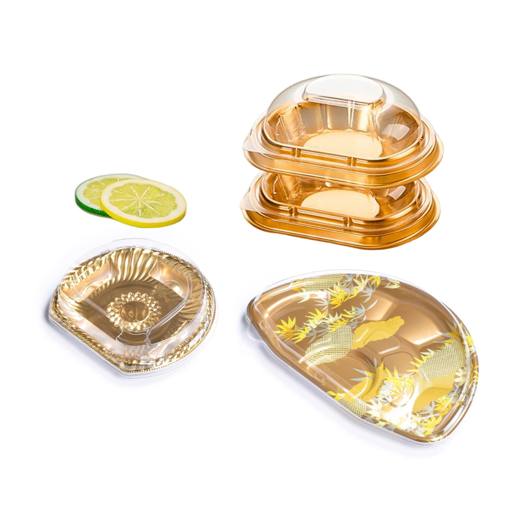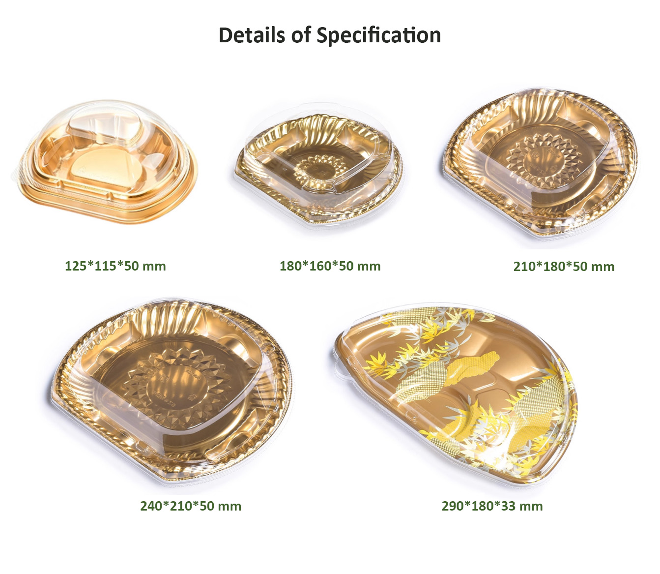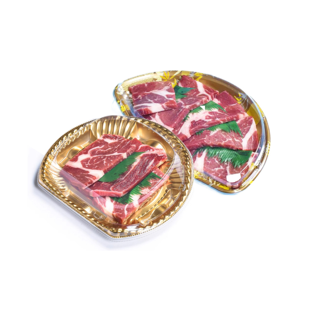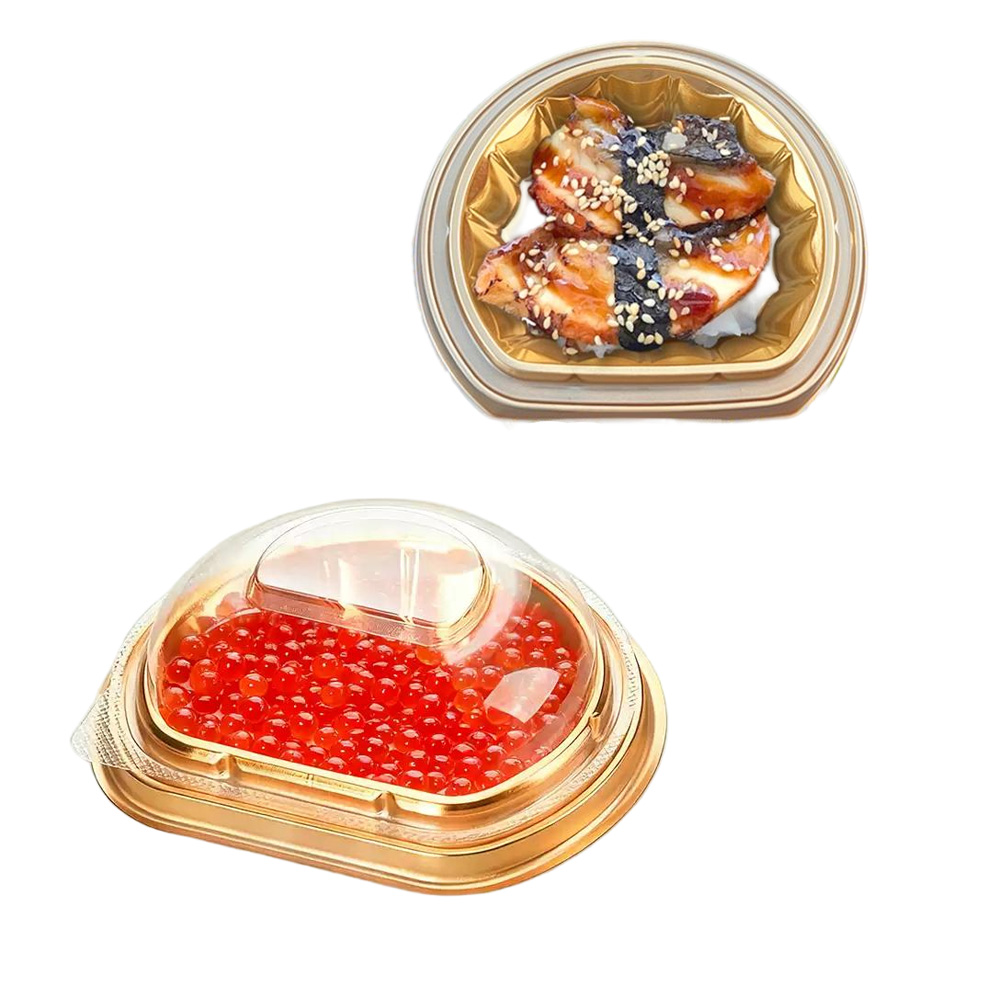 JF Series golden plastic semi-circular food containers with lids are our general food packaging for side dishes, appetizers, beef, sushi, etc., there are various sizes and printings you can choose.