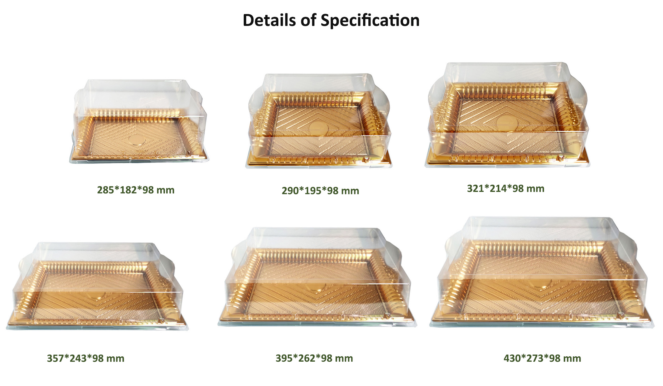 JF Series disposable golden plastic cake containers/boxes with courtly style, they are suitable for cake, deserts, etc., there are various sizes and printings you can choose.