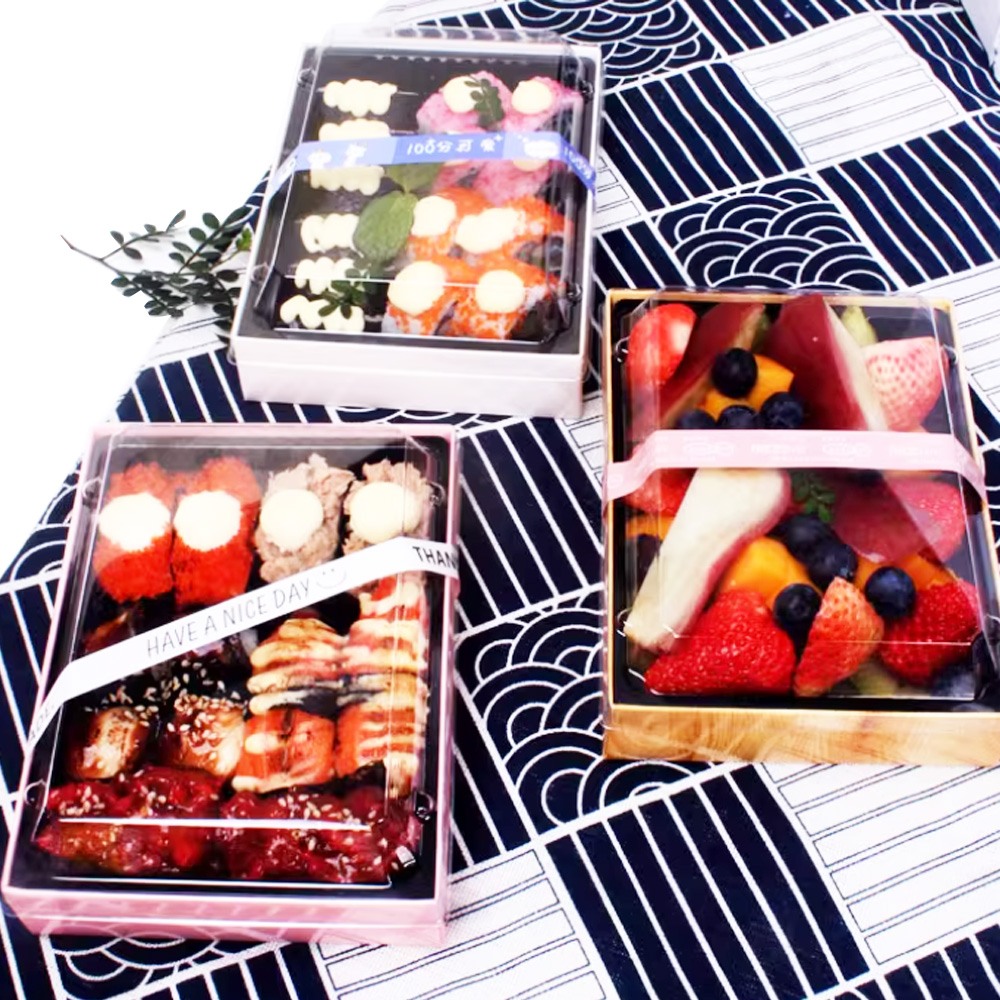 JF25P-160 rectangular printed paper containers are our new created food packaging for sushi, sashimi, sea urchin, fruit, cake, etc. which made of biodegradable kraft paper. There are various sizes you can choose.