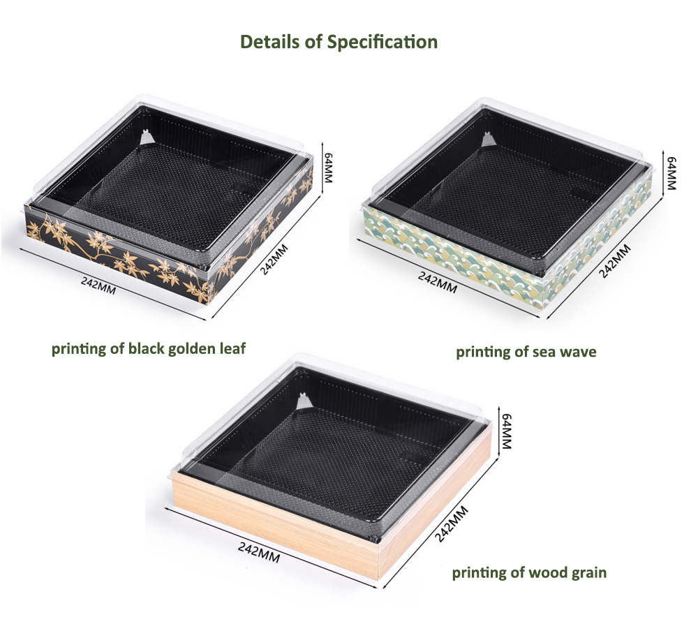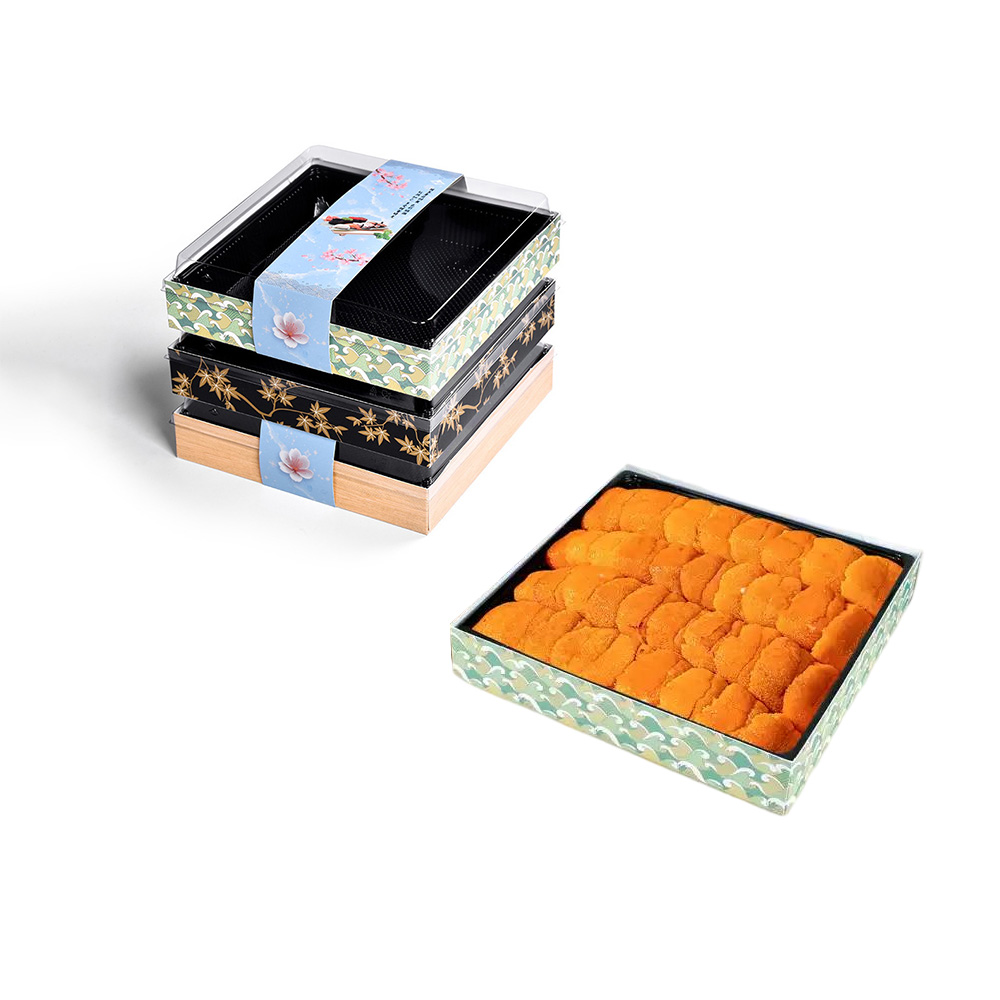 JF25P-242 square paper sushi containers are our new created Japanese food packaging for sushi, sashimi, sea urchin, etc. which made of biodegradable kraft paper. There are various sizes you can choose.