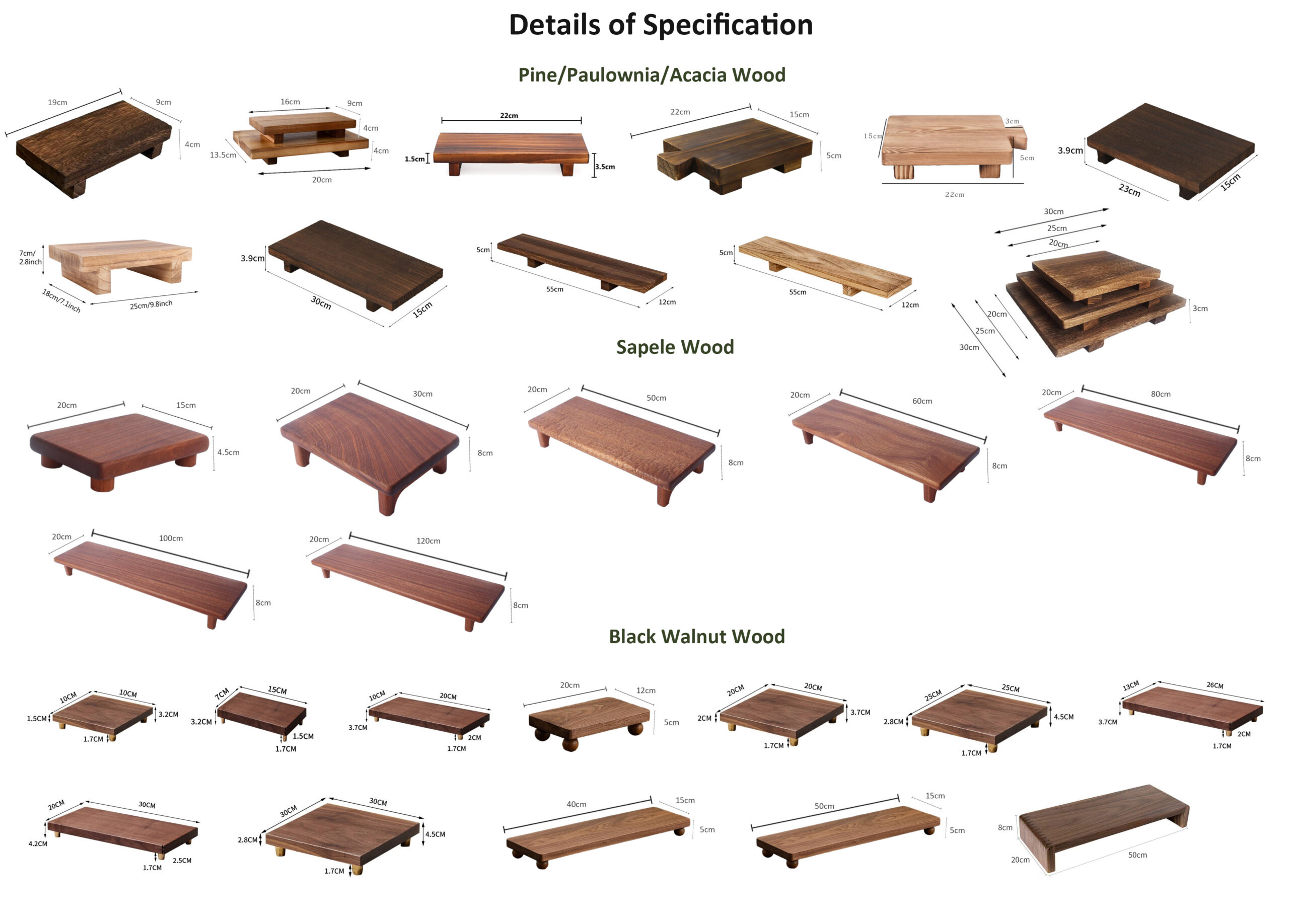 190*90*40 mm (paulownia), 160*90*40 mm (acacia), 200*135*40 mm (acacia), 220*90*35 mm (pine), 220*150*50 mm (A/pine), 220*150*50 mm (B/pine), 230*150*39 mm (paulownia), 250*180*70 mm (paulownia), 300*150*39 mm (paulownia), 550*120*50 mm (A/paulownia), 550*120*50 mm (B/paulownia), 200*200*30 mm (paulownia), 250*250*30 mm (paulownia), 300*300*30 mm (paulownia), 200*150*45 mm (sapele), 300*200*80 mm (sapele), 500*200*80 mm (sapele), 600*200*80 mm (sapele), 800*200*80 mm (sapele), 1000*200*80 mm (sapele), 1200*200*80 mm (sapele), 100*100*32 mm (black walnut), 150*70*32 mm (black walnut), 200*100*37 mm (black walnut), 200*120*50 mm (black walnut), 200*200*37 mm (black walnut), 250*250*45 mm (black walnut), 260*130*37 mm (black walnut), 300*200*42 mm (black walnut), 300*300*45 mm (black walnut), 400*150*50 mm (black walnut), 500*150*50 mm (black walnut), 500*200*80 mm (black walnut)
