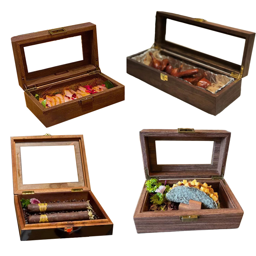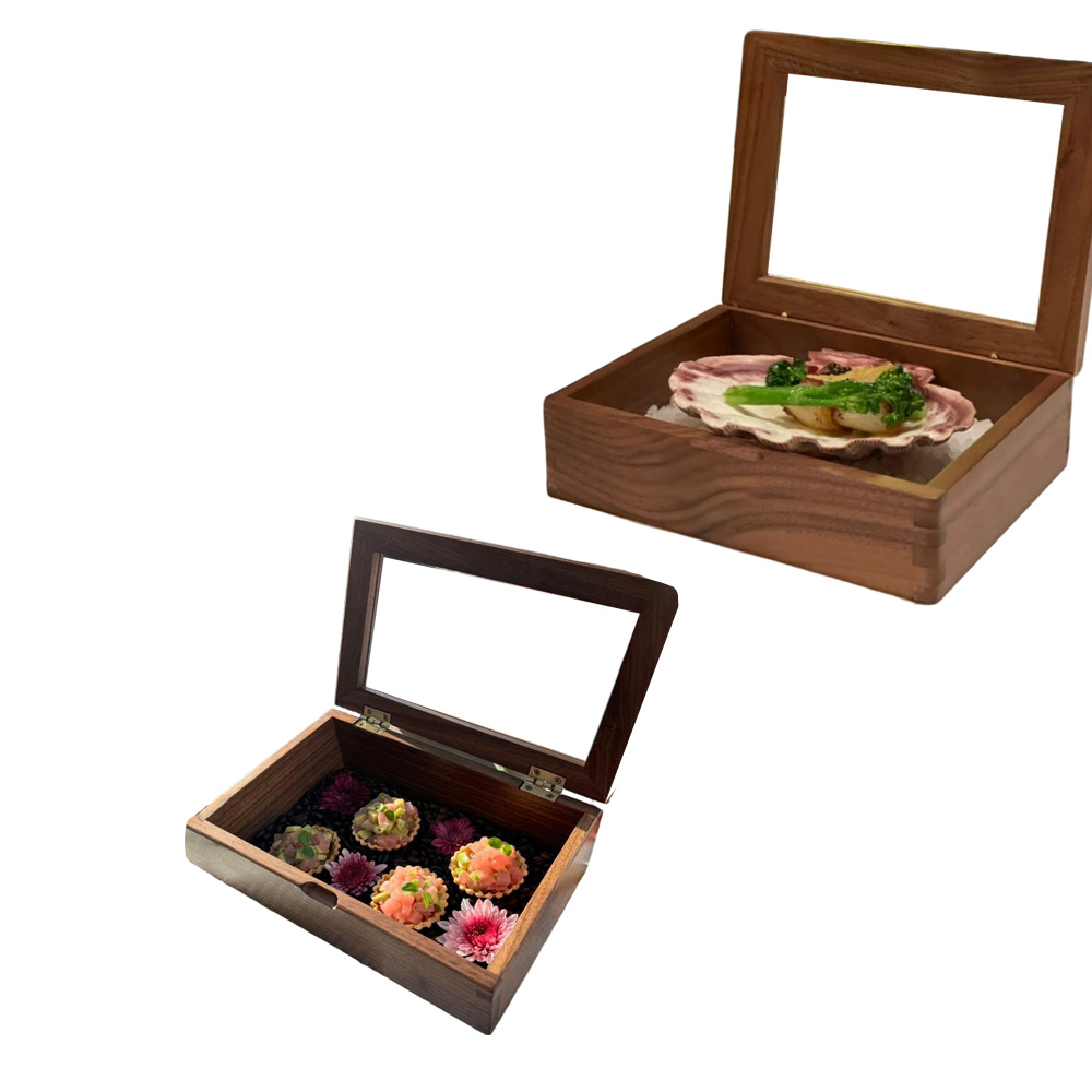P Series vintage wooden boxes with flip clear lids are our new lines of food packaging for sushi, sashimi, cakes, etc., there are various sizes that you can choose. These wooden containers are made by high quality pine wood, which is eco-friendly and environmentally.