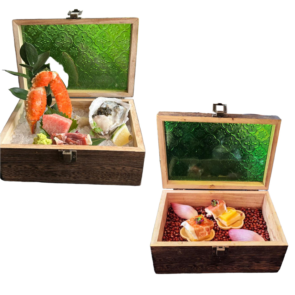 P Series vintage style wooden boxes with flip green crabapple lids are our new lines of food packaging for sushi, yakitori, beef, deserts, cakes, fruits, etc. there are various sizes that you can choose. These wooden containers are made by high quality pine wood, which is eco-friendly and environmentally.