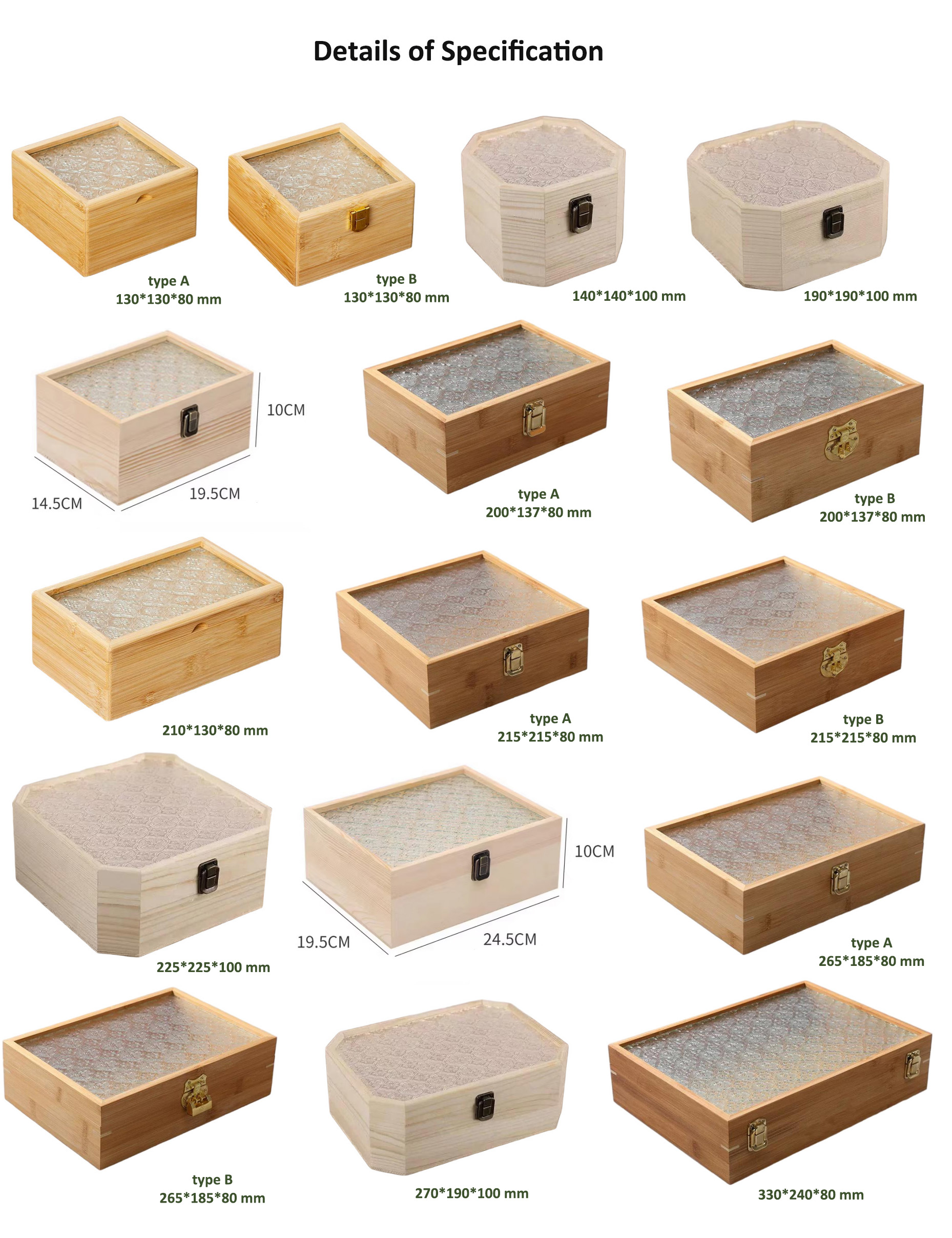 130*130*80 mm (A), 130*130*80 mm (B), 140*140*100 mm, 190*190*100 mm, 195*145*100 mm, 200*137*80 mm (A), 200*137*80 mm (B), 210*130*80 mm, 215*215*80 mm (A), 215*215*80 mm (B), 225*225*100 mm, 245*195*100 mm, 265*185*80 mm (A), 265*185*80 mm (B), 270*190*100 mm, 330*240*80 mm