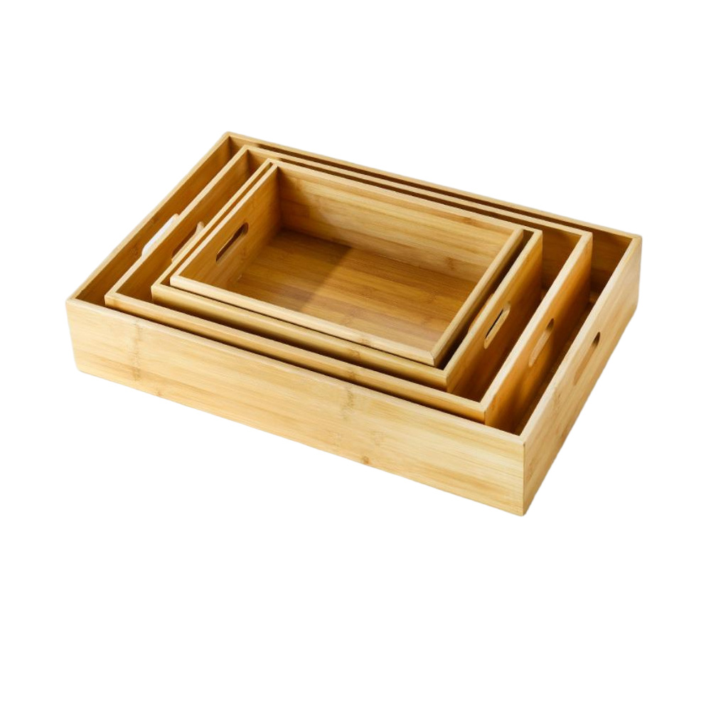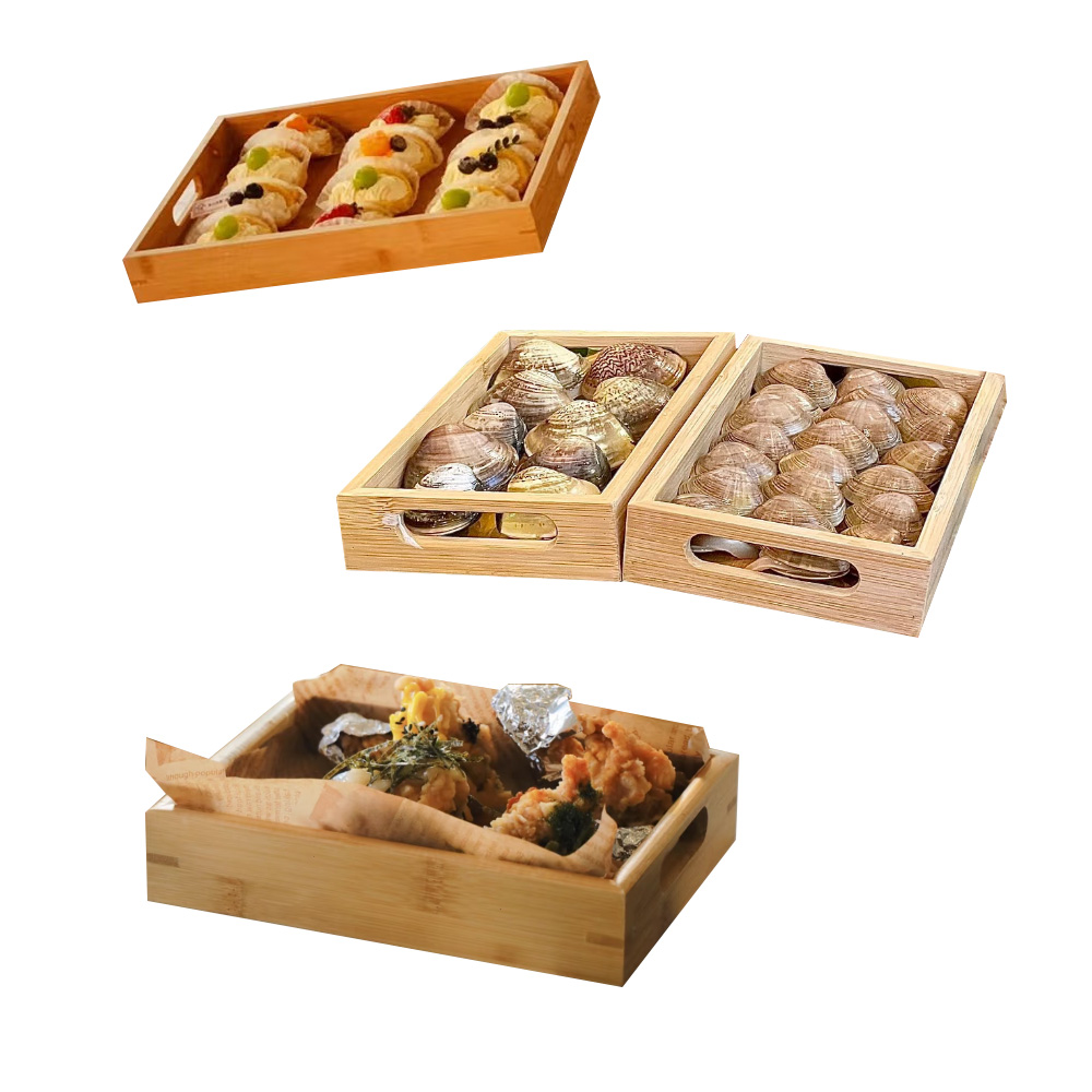P Series bamboo trays with handles are our new lines of packaging for sashimi, steak, fruits, bread, etc.. there are various sizes that you can choose. These bamboo containers are made by high quality bamboo, which is eco-friendly and environmentally.