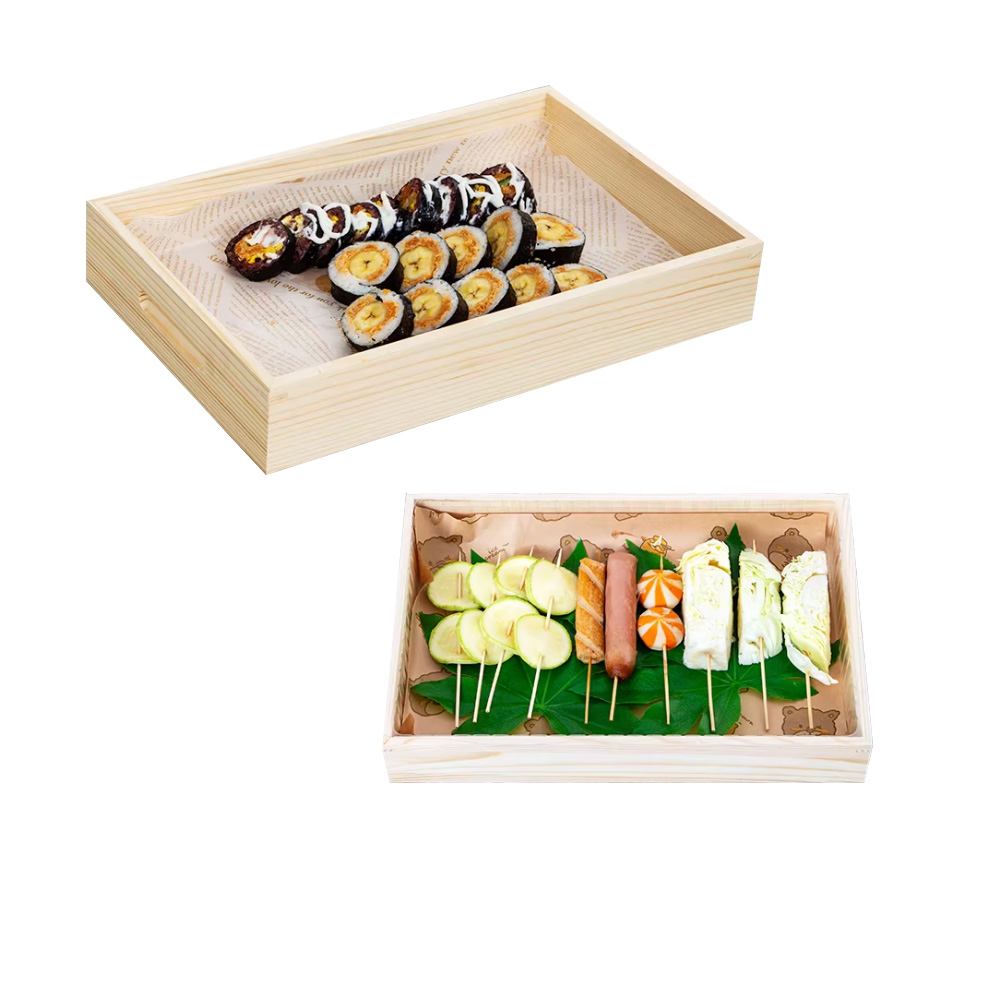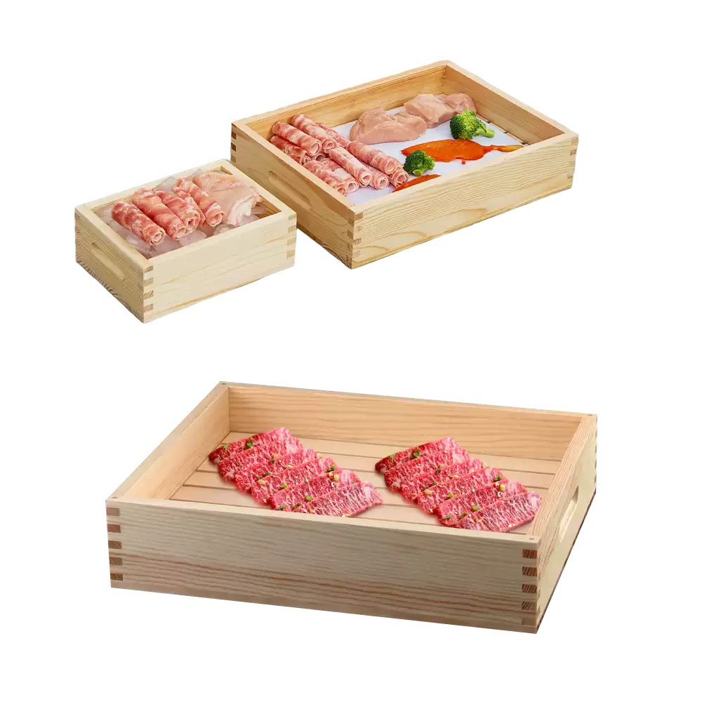 P Series wooden boxes and trays with handles are our new lines of packaging for sashimi, steak, fruits, bread, etc.. there are various sizes that you can choose. These wooden containers are made by high quality pine wood, which is eco-friendly and environmentally.