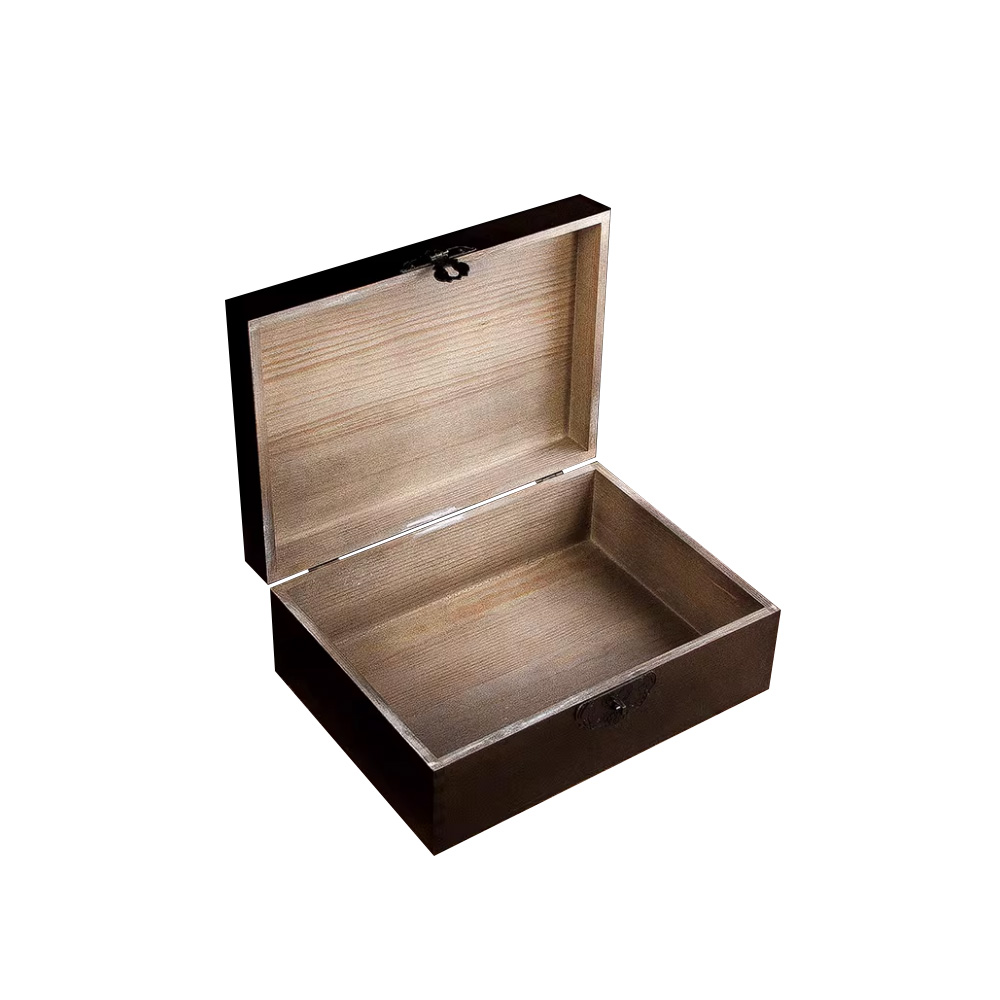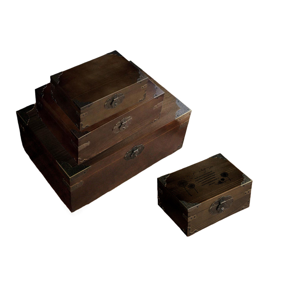 P20090-440180 coffee brown wooden vintage containers with irony angles flip lids and printing