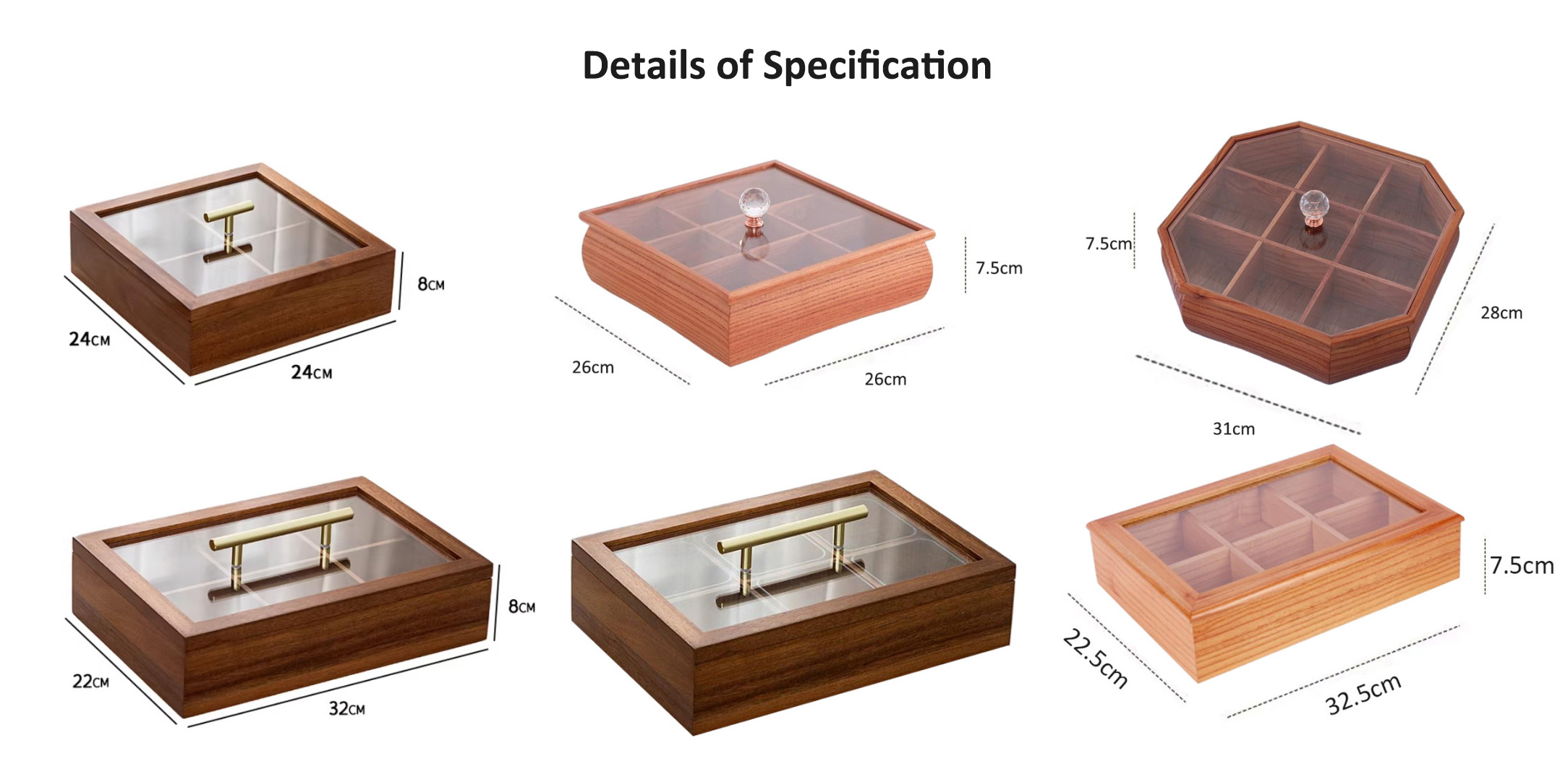 240*240*80 mm (acacia), 260*260*75 mm (Toona), 310*280*75 mm (Toona), 320*220*80 mm (acacia), 320*220*80 mm (acacia with inner tray), 325*225*75 mm (Toona)