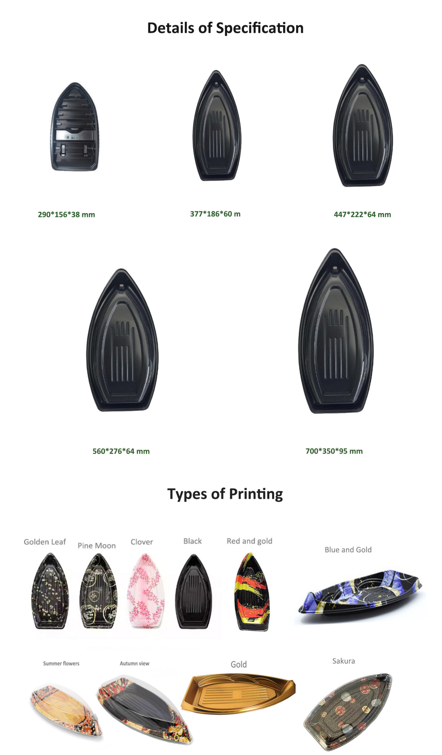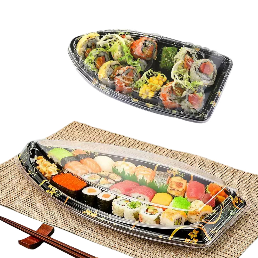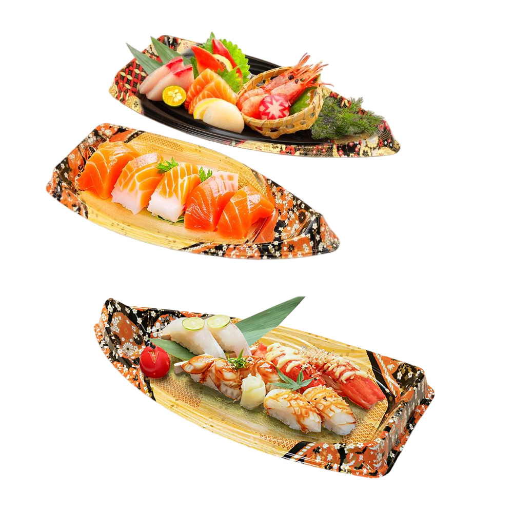 JF Series printed sushi boat containers are our general Japanese food packaging for sushi, there are various sizes and printings you can choose.