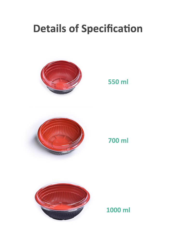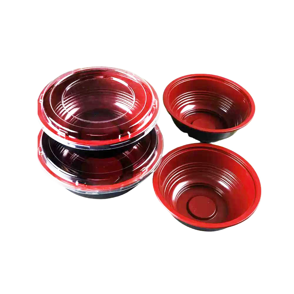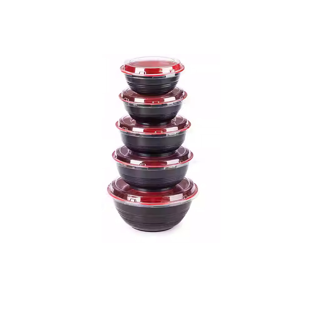 JF Series red and black PP round bowls are suit for soup, rice, salad and other foods.