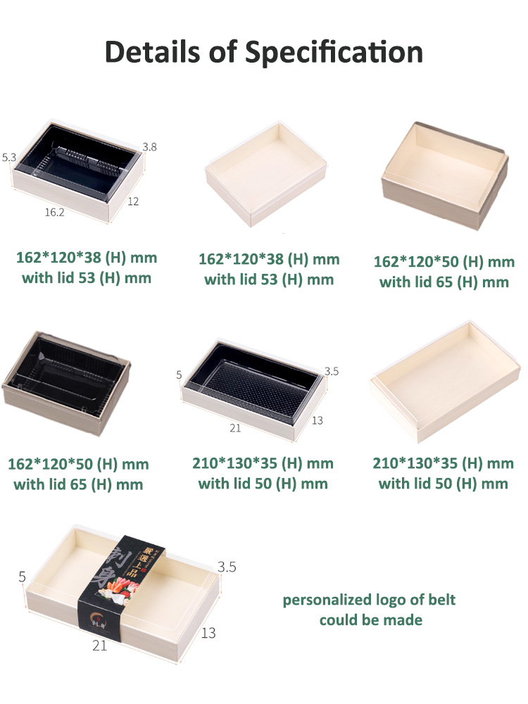 S Series wooden sushi containers are our new lines of Japanese food packaging for sushi, there are various sizes that you can choose. These wooden sushi containers are made by poplar bark, PP and PET, which is eco-friendly and environmentally.
